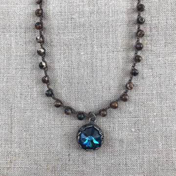 This dark bracelet comes to life in the sunlight. Riverbed is a hand-loomed bracelet of Japanese seed beads and fire-polished Czech glass beads in dark gray, green, and copper. It’s woven on navy nylon cord and finished with antique copper crimps, chain, and clasp. The final touch is a Swarovski crystal bead at the end of the extender. 6 3/4" to 7 1/2” L.